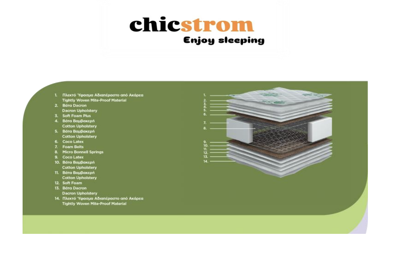 Η εξωτερική επένδυση από πλεκτό ύφασμα αδιαπέραστο από ακάρεα προσφέρει προστασία από αλλεργιογόνους παράγοντες, διατηρώντας ένα υγιεινό και καθαρό περιβάλλον ύπνου. Η βάτα Dacron και η βαμβακερή βάτα, τοποθετημένες σε ανώτερες και κατώτερες στρώσεις, επιτρέπουν στο στρώμα να “αναπνέει”, συμβάλλοντας στη ρύθμιση της θερμοκρασίας και στην αποφυγή υγρασίας.