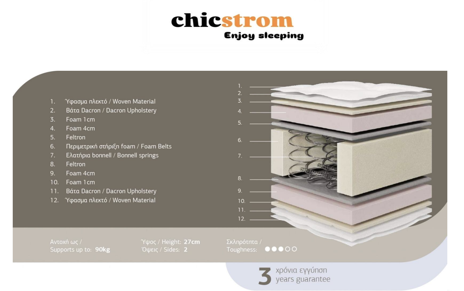 Στον πυρήνα του στρώματος βρίσκονται ελατήρια τύπου Bonnell, μια κλασική και αξιόπιστη επιλογή για όσους επιθυμούν σταθερή και διαχρονική στήριξη. Η δομή των ελατηρίων ενισχύεται από περιμετρική στήριξη foam (Foam Belts), προσφέροντας επιπλέον σταθερότητα και προστασία από παραμορφώσεις στις άκρες του στρώματος.