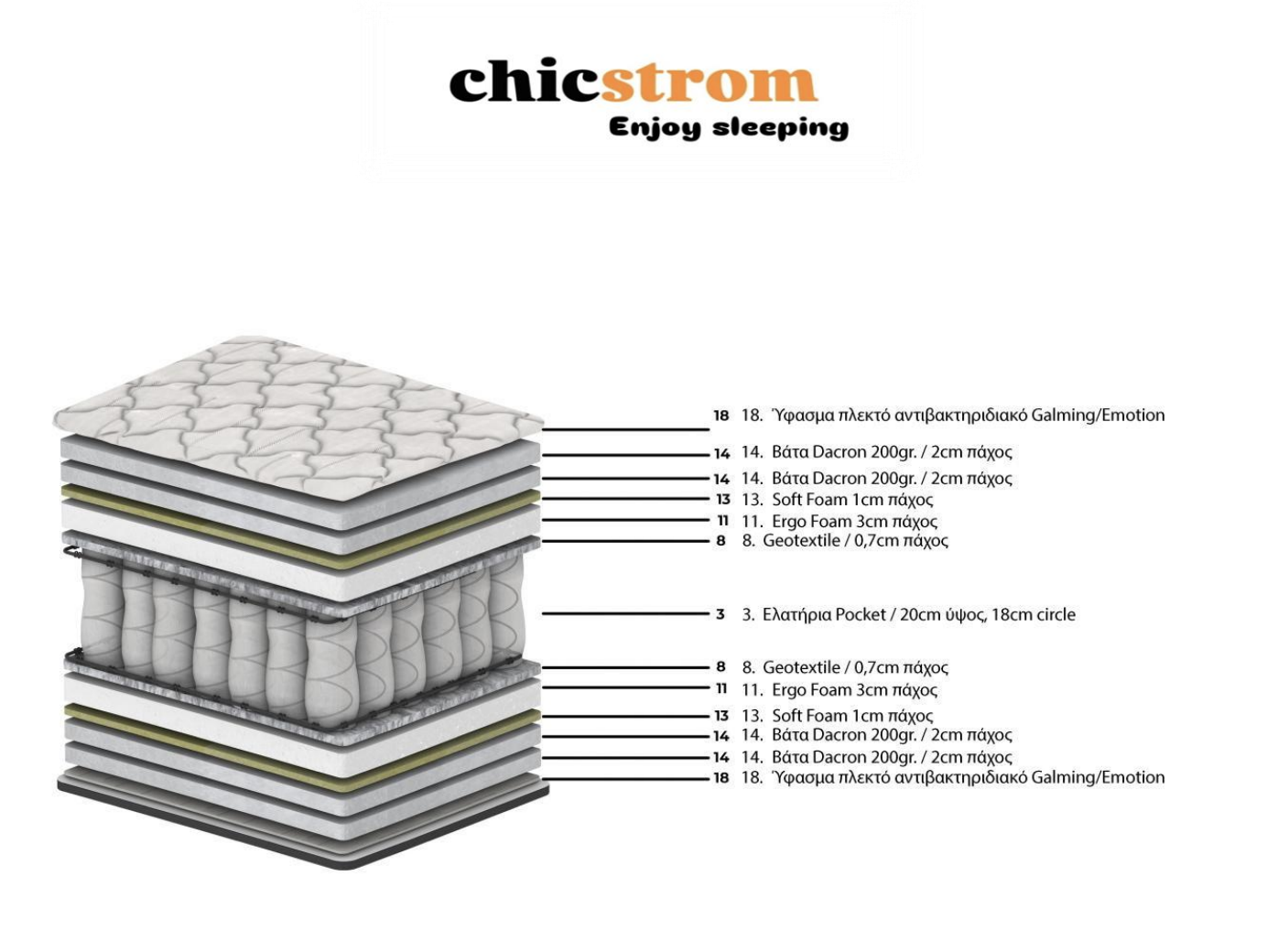 Η εξωτερική του επένδυση από πλεκτό αντιβακτηριδιακό ύφασμα Galming προσφέρει άμεση αίσθηση καθαριότητας και υγιεινής, αποτρέποντας την ανάπτυξη μικροβίων και δυσάρεστων οσμών. Οι δύο στρώσεις Dacron 200gr. (2cm η καθεμία) αγκαλιάζουν απαλά το σώμα, ενώ το Soft Foam 1cm προσθέτει ελαφριά ελαστικότητα στην πρώτη επαφή με το στρώμα.