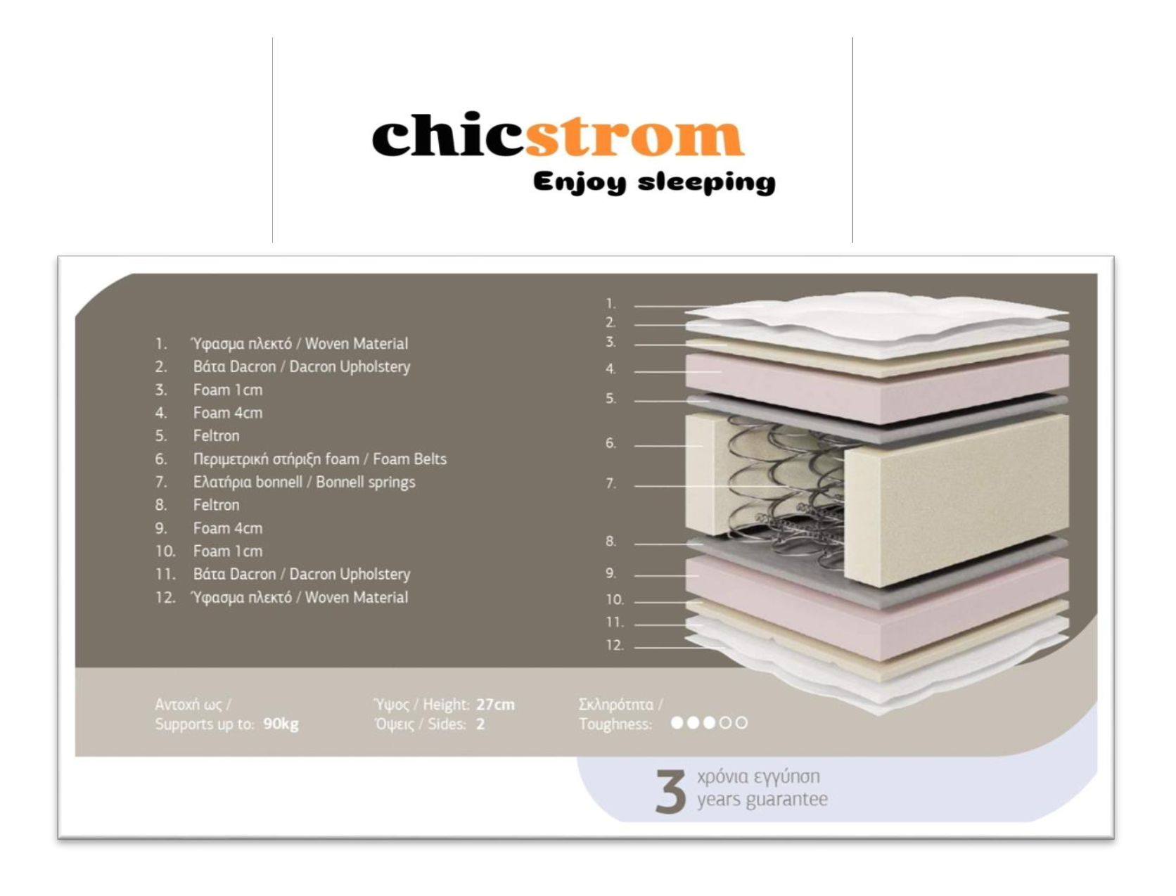 Το στρώμα Fresh είναι σχεδιασμένο για να προσφέρει ισορροπία ανάμεσα στην ανατομική υποστήριξη και τη φρεσκάδα ενός άνετου, καλά αεριζόμενου ύπνου. Με ύψος 27 εκατοστά, στηρίζεται σε στιβαρά υλικά και εργονομική σύνθεση που εξυπηρετεί τις ανάγκες του σύγχρονου ύπνου.