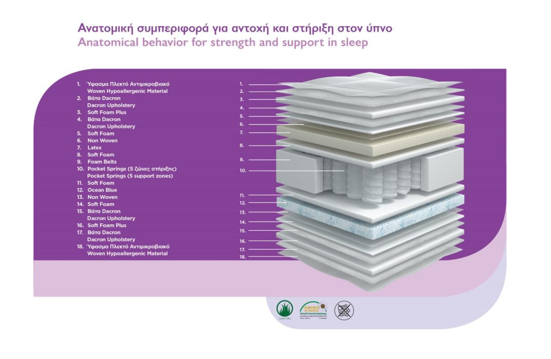 Η προσθήκη βάτας Dacron σε πολλαπλές στρώσεις συμβάλλει στην αναπνοή του στρώματος και ενισχύει την αίσθηση φρεσκάδας, ενώ τα στρώματα Ocean Blue και Non Woven υλικών ολοκληρώνουν την εσωτερική δομή του με επιπλέον σταθερότητα και διαπνοή.
