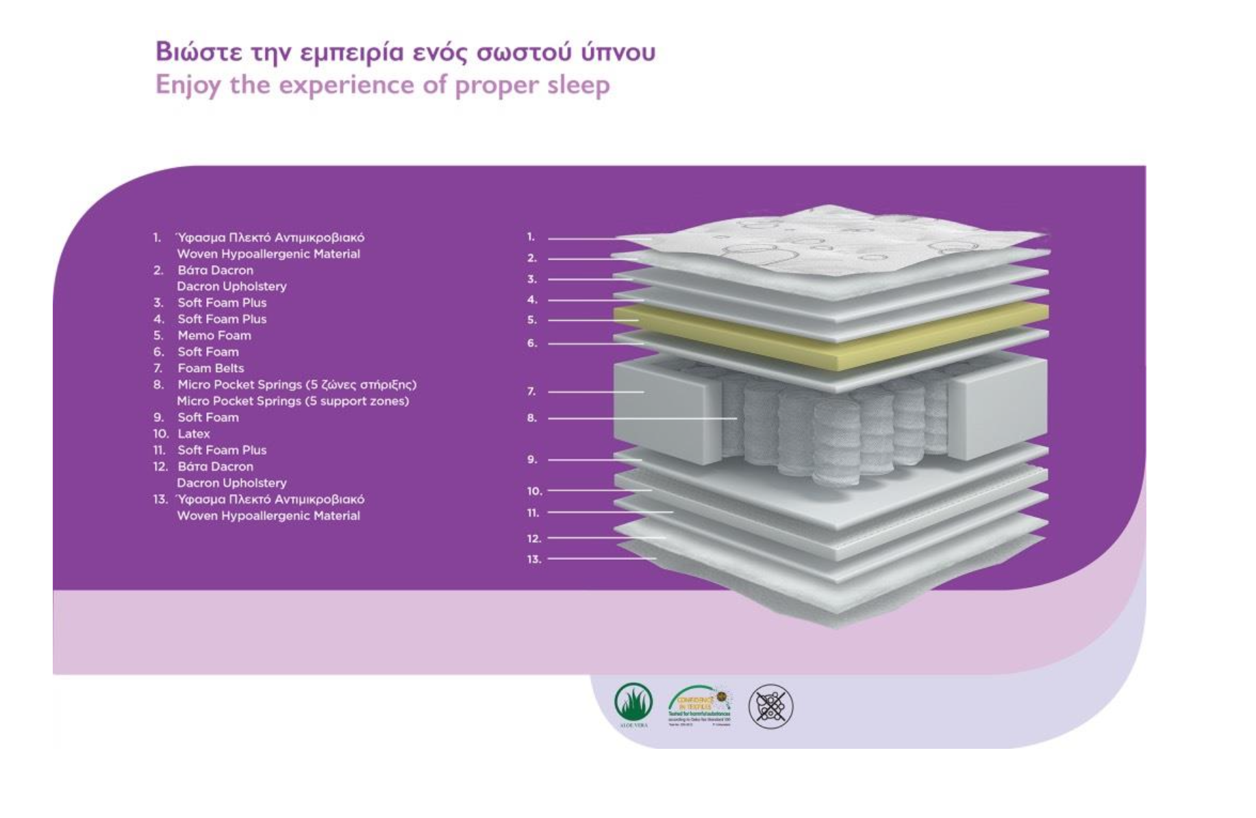 Το στρώμα ολοκληρώνεται με πολλαπλές στρώσεις αφρού (Soft Foam, Soft Foam Plus) και βάτα Dacron, οι οποίες προσθέτουν μια απαλή και αφράτη αίσθηση, χωρίς να θυσιάζεται η σταθερότητα. Οι Foam Belts ενισχύουν τη δομή περιμετρικά, για να διατηρεί το σχήμα του ακόμα και μετά από χρόνια χρήσης.