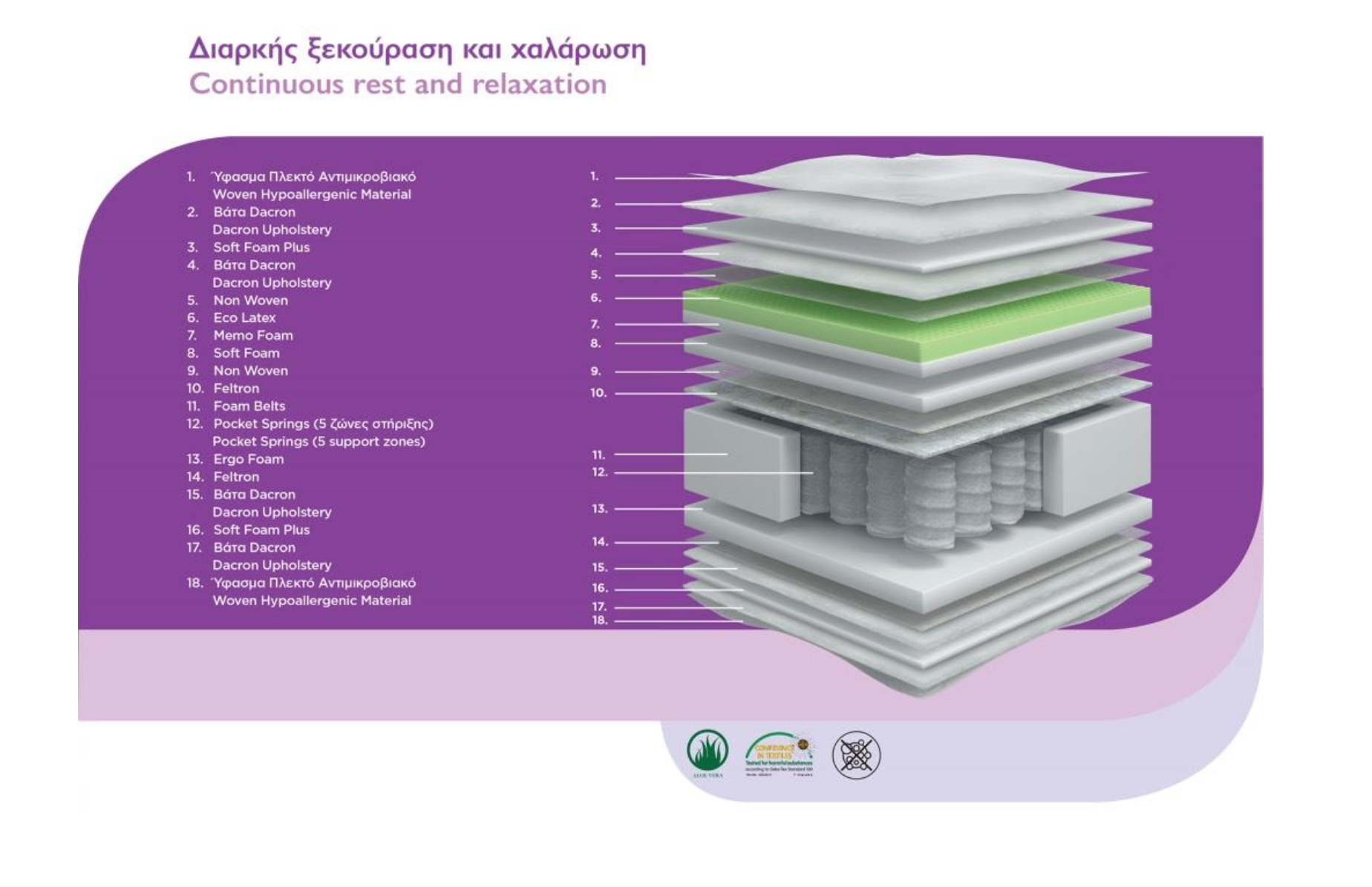 Το σύστημα Pocket Springs 5 ζωνών στήριξης εγγυάται ανεξάρτητη στήριξη και σωστή ευθυγράμμιση της σπονδυλικής στήλης, ενώ οι Foam Belts ενισχύουν την περιμετρική σταθερότητα του στρώματος, αποτρέποντας την παραμόρφωση με την πάροδο του χρόνου. Το υλικό Feltron συμβάλλει στην ενίσχυση της αντοχής και στη σωστή κατανομή του βάρους, και η προσθήκη Ergo Foam στη βάση ολοκληρώνει τη δομή με μια στιβαρή αλλά ευέλικτη υποστήριξη.