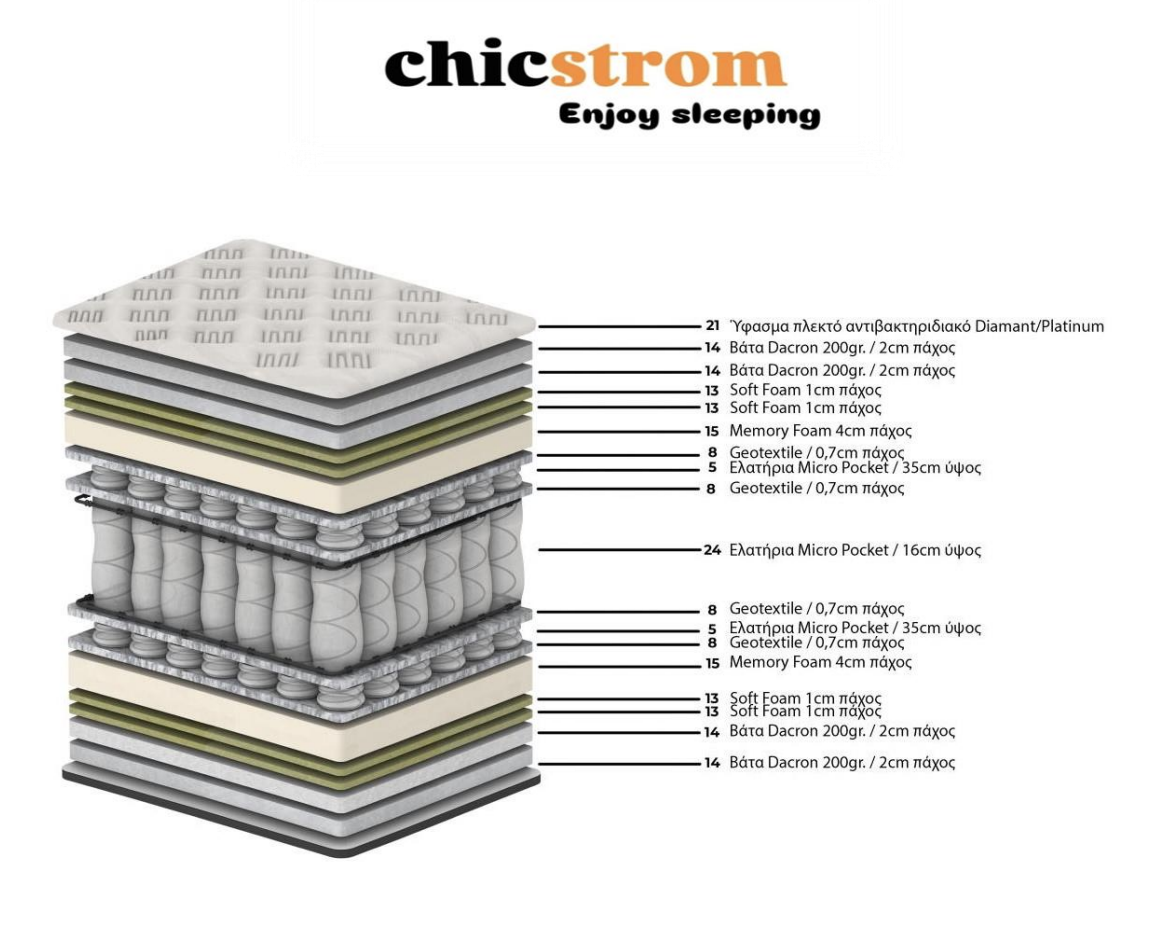 Ανάμεσα στις στρώσεις, τα γεωυφάσματα (0,7cm) λειτουργούν ως φράγμα προστασίας και σταθερότητας, παρατείνοντας τη διάρκεια ζωής του στρώματος και διατηρώντας τη συνοχή των υλικών. Το σύστημα ολοκληρώνεται με δεύτερη στρώση Memory Foam 4cm, διπλό Soft Foam 1cm, βάτα Dacron 2cm x2 και το τελικό αντιβακτηριδιακό ύφασμα.